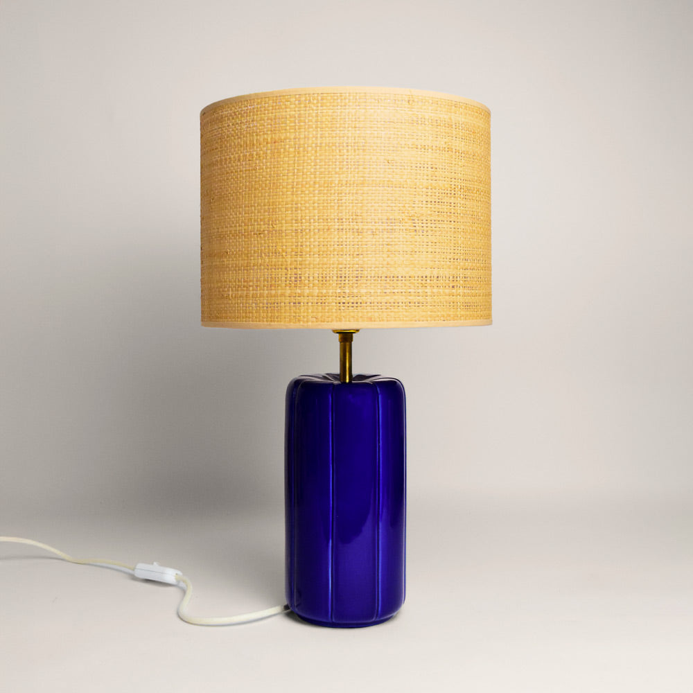 Abat-jour en raphia tressé et pied en céramique bleu indigo. Un contraste fort et élégant, entre modernité et artisanat.