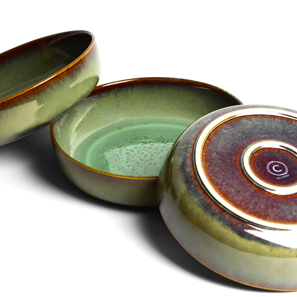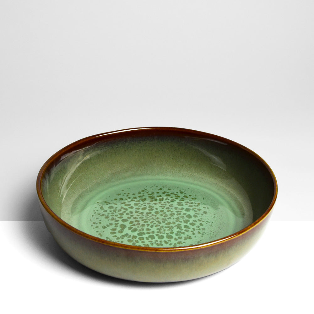 Émail : Un émail vert kaki réactif légèrement acidulé avec des effets mouchetés à l'intérieur, agrémenté d'un liseré marron plus ou moins foncé sur le rebord de la pièce.