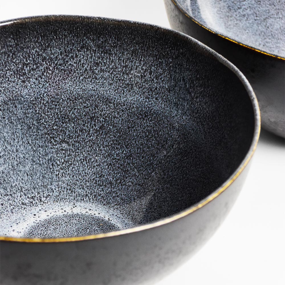 Émail : Un émail noir mat sur l'extérieur des pièces avec des effets réactifs blancs / bleutés brillants sur l'intérieur.