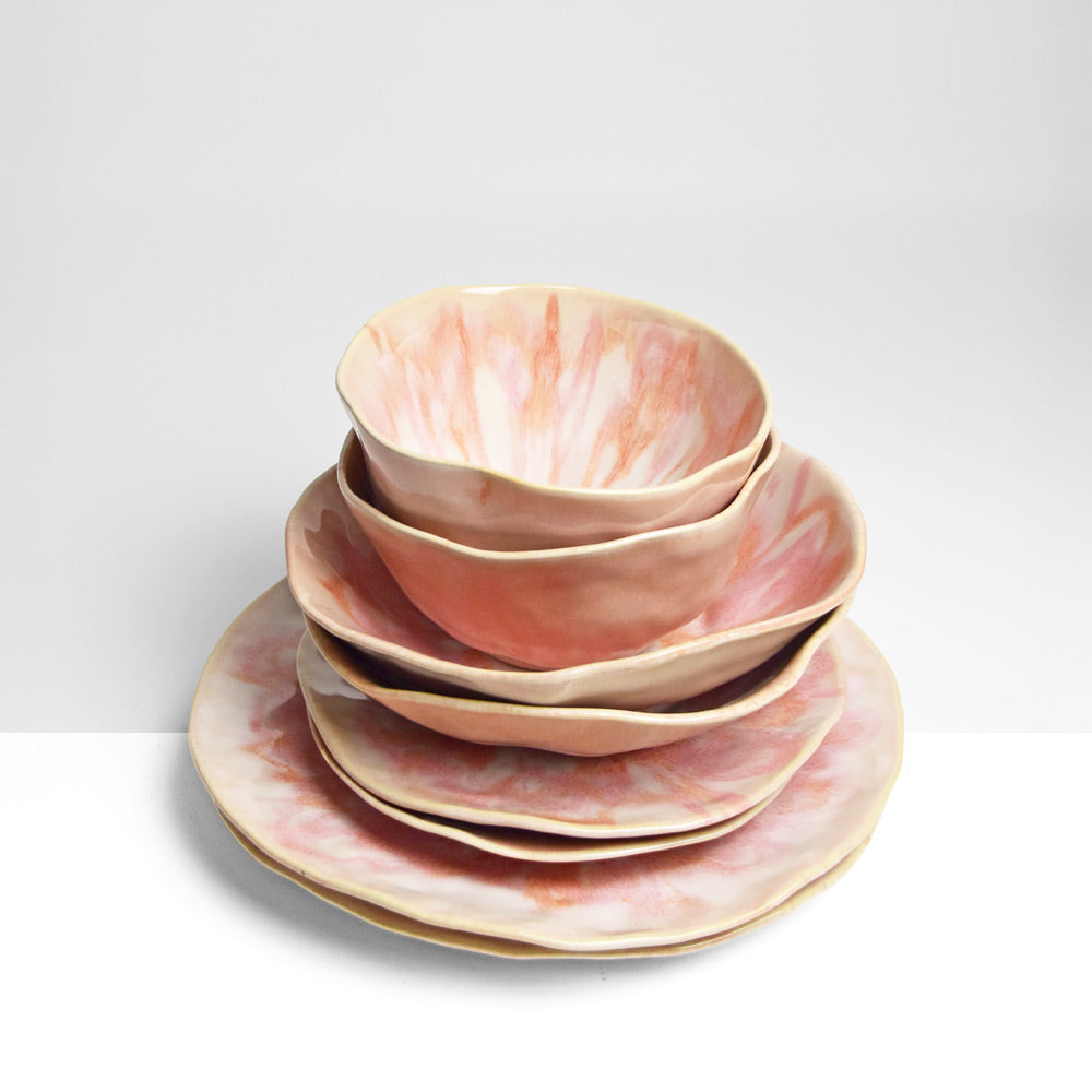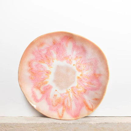 Des assiettes comme des fragments d’été, patinées par la main, baignées de couleurs tendres et solaires. Chaque pièce évoque un moment suspendu : un déjeuner à l’ombre d’un parasol, un soir de juillet où la lumière se couche sur le sable encore chaud.