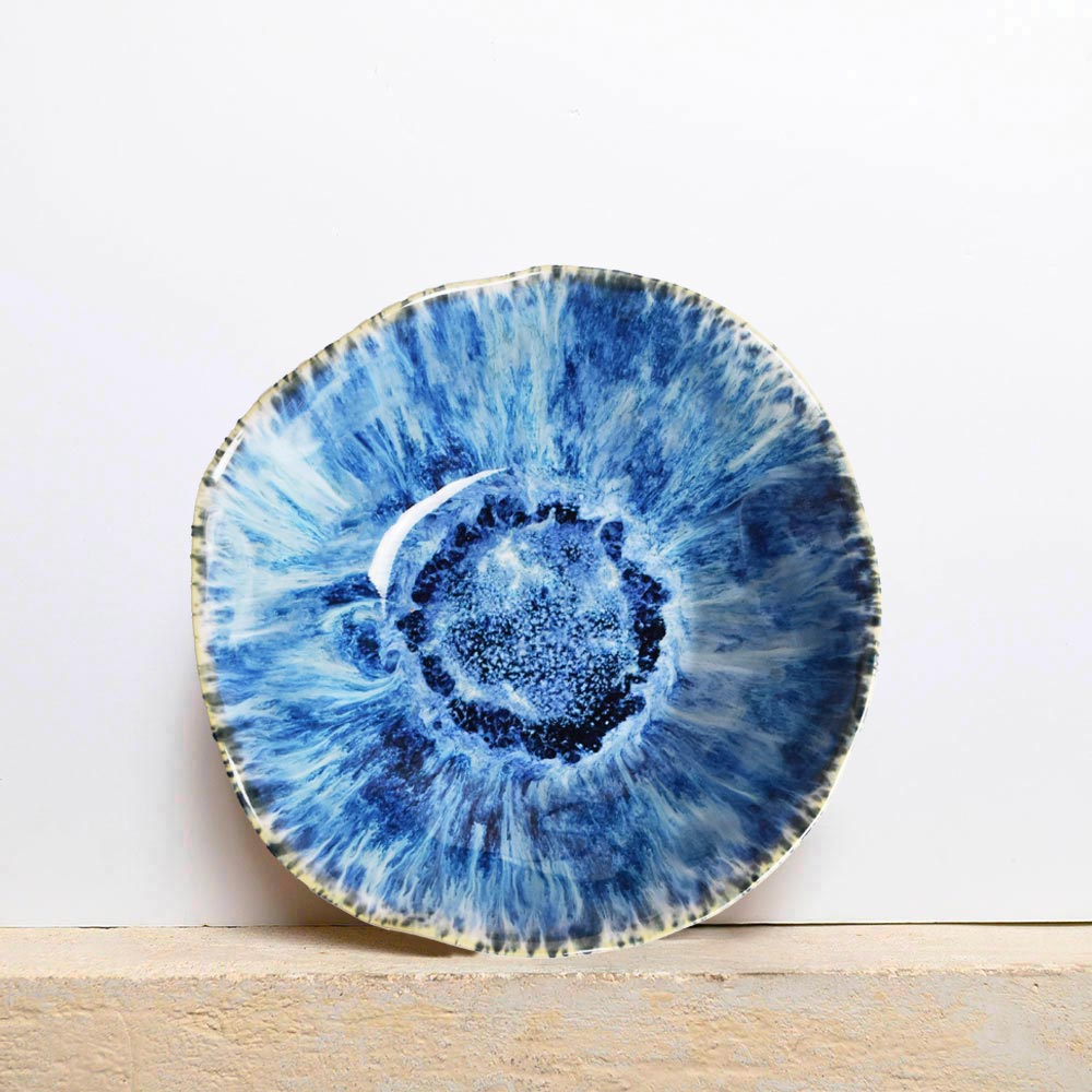 Émail : Le Bleu Écume capture le mouvement de l’eau et la lumière changeante des vagues. Les nuances se fondent en transparences et dégradés, évoquant le va-et-vient de la mer sous le soleil.