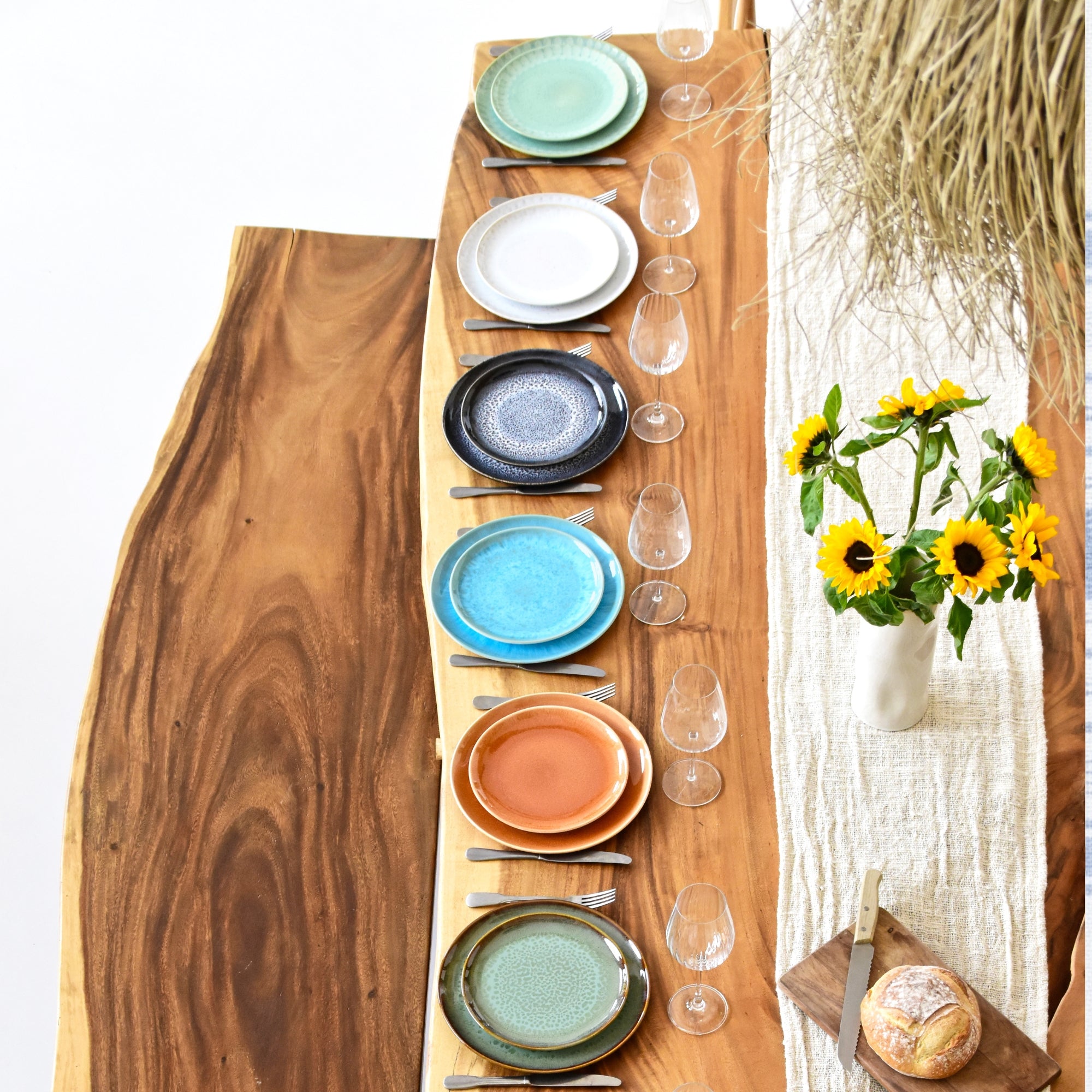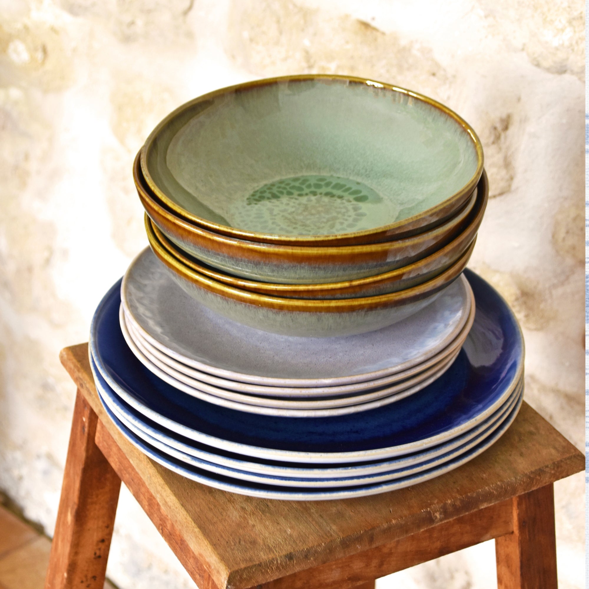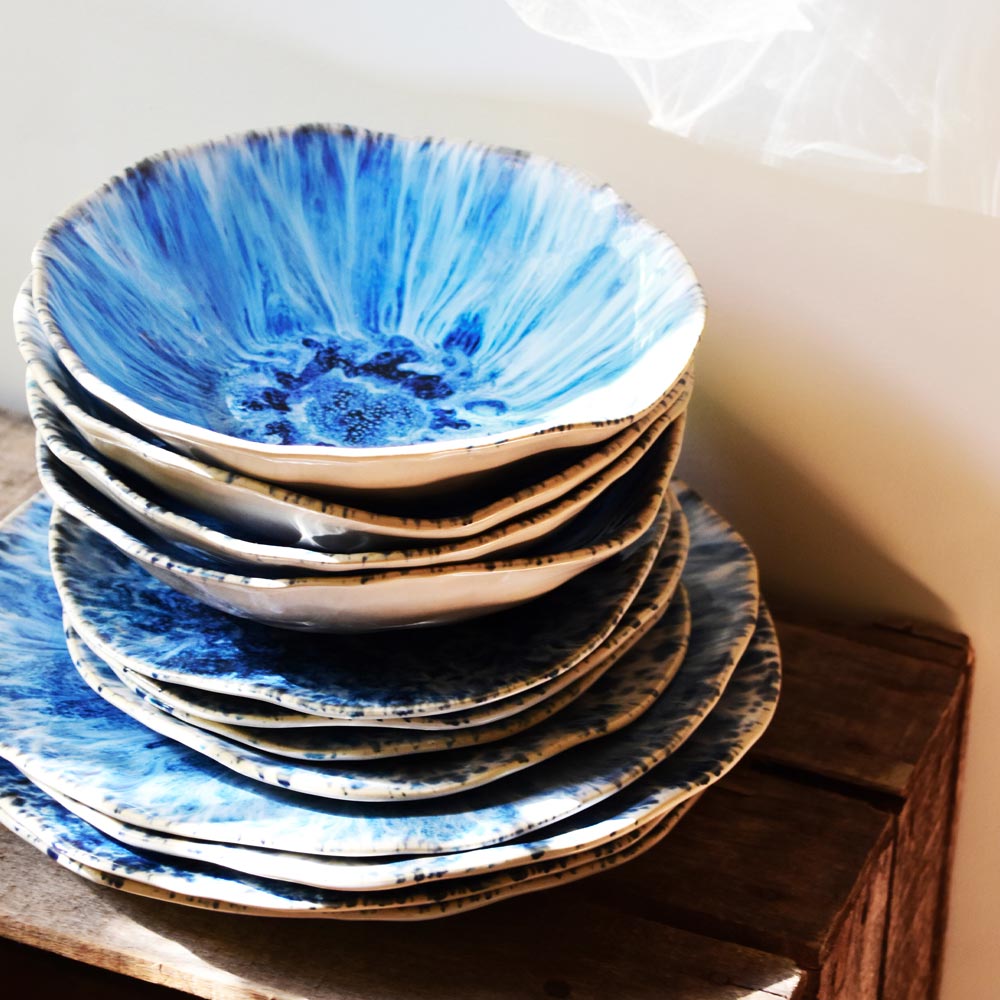 Des assiettes comme des fragments d’été, patinées par la main, baignées de couleurs tendres et solaires. Chaque pièce évoque un moment suspendu : un déjeuner à l’ombre d’un parasol, un soir de juillet où la lumière se couche sur le sable encore chaud.